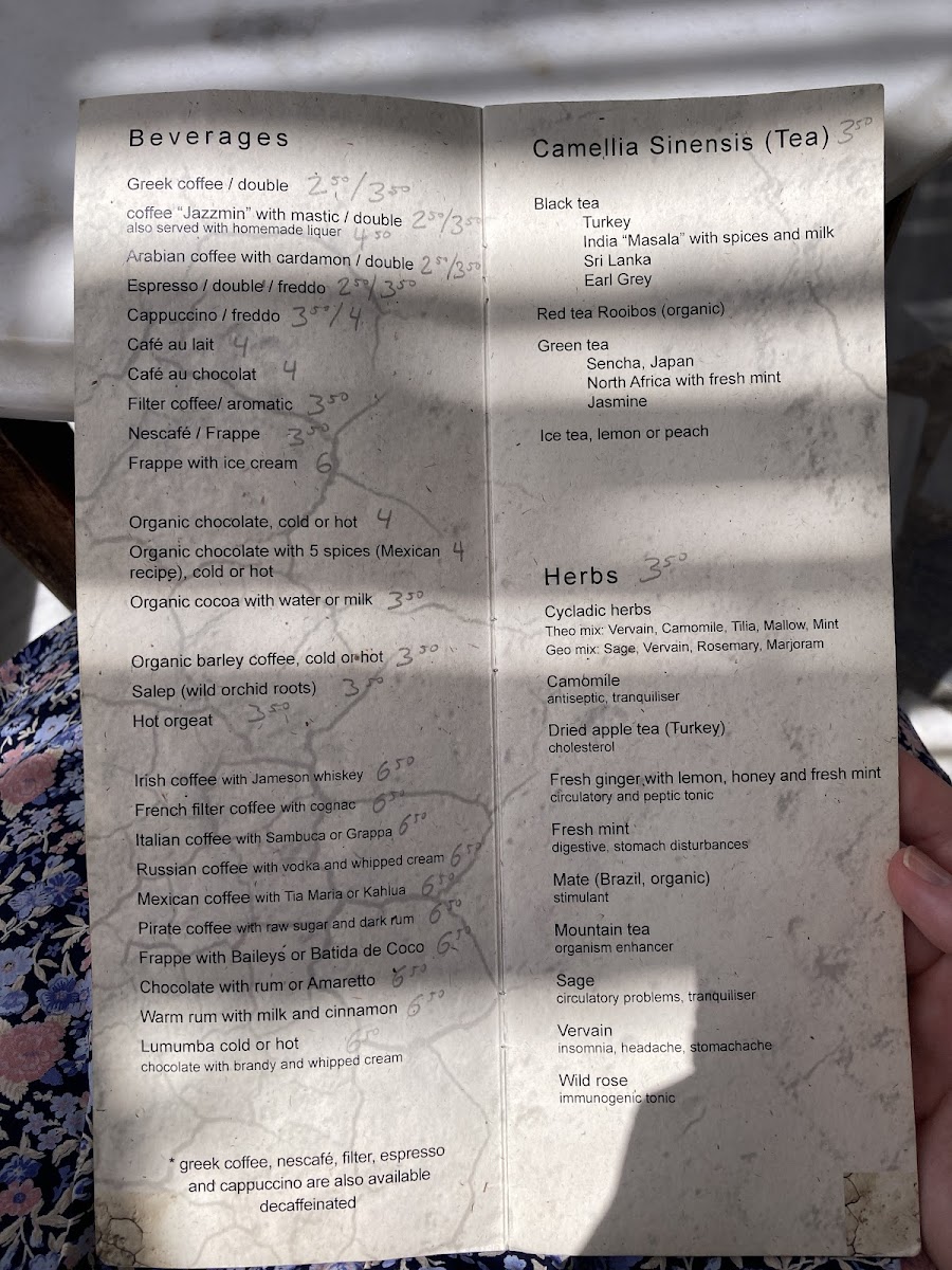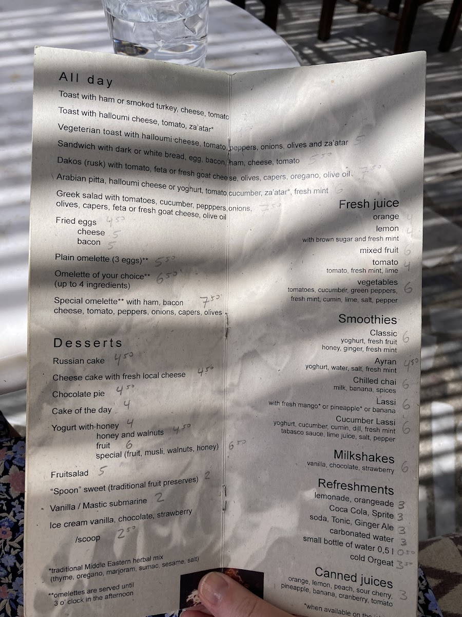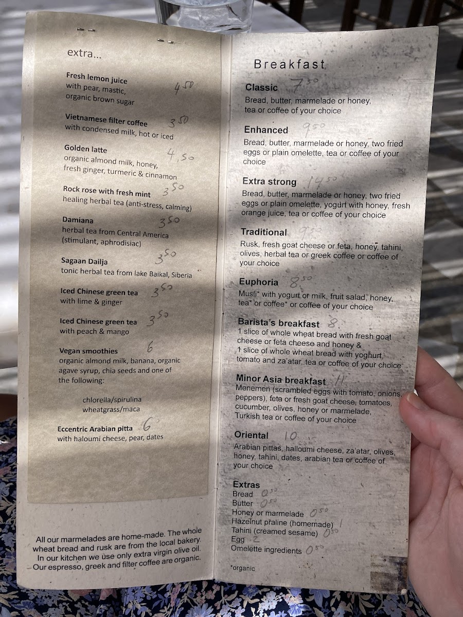 The menu highlights a variety of coffee styles from traditional Greek coffees infused with mastic to refreshing freddo espresso and café au lait. Alongside these, fresh and natural options like vegan smoothies with chlorella and freshly squeezed juices fit seamlessly into the laid-back, sunlit atmosphere. Light dishes such as mikrasiatiko (Asia Minor) breakfast plates, dakos, omelets, and pastries like paximadi offer balanced, flavorful choices that complement the café’s inviting and cozy vibe.