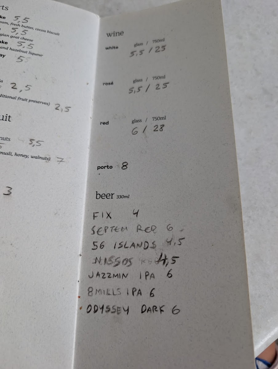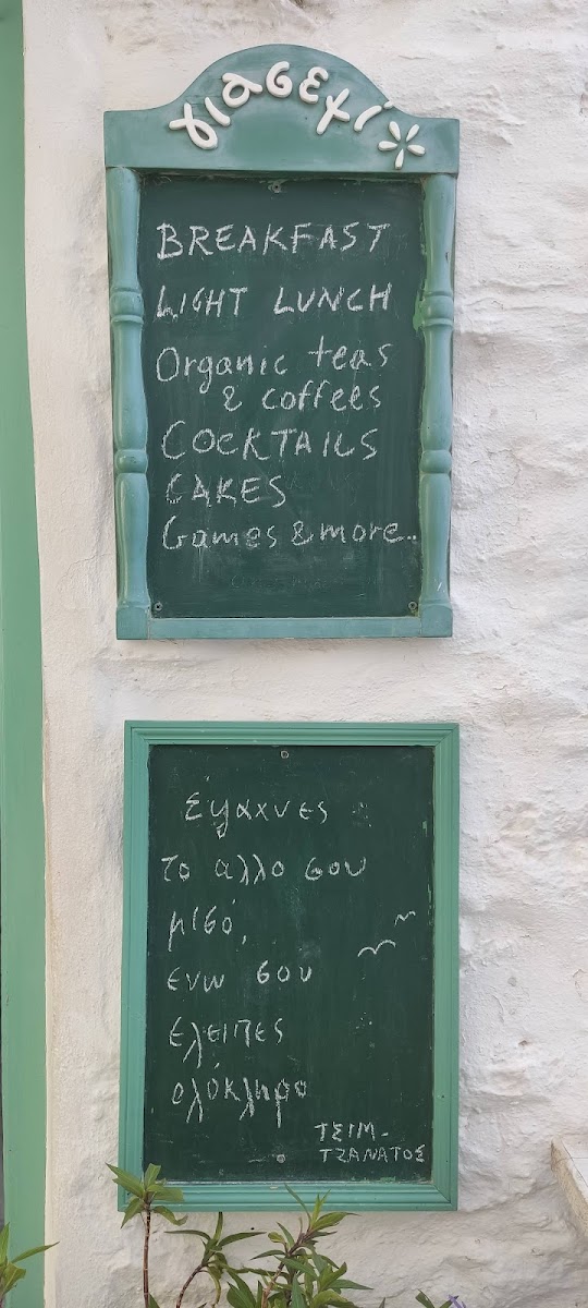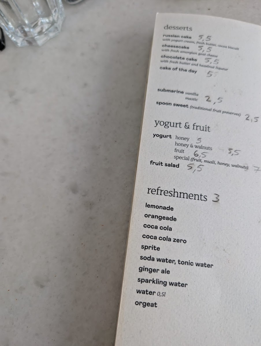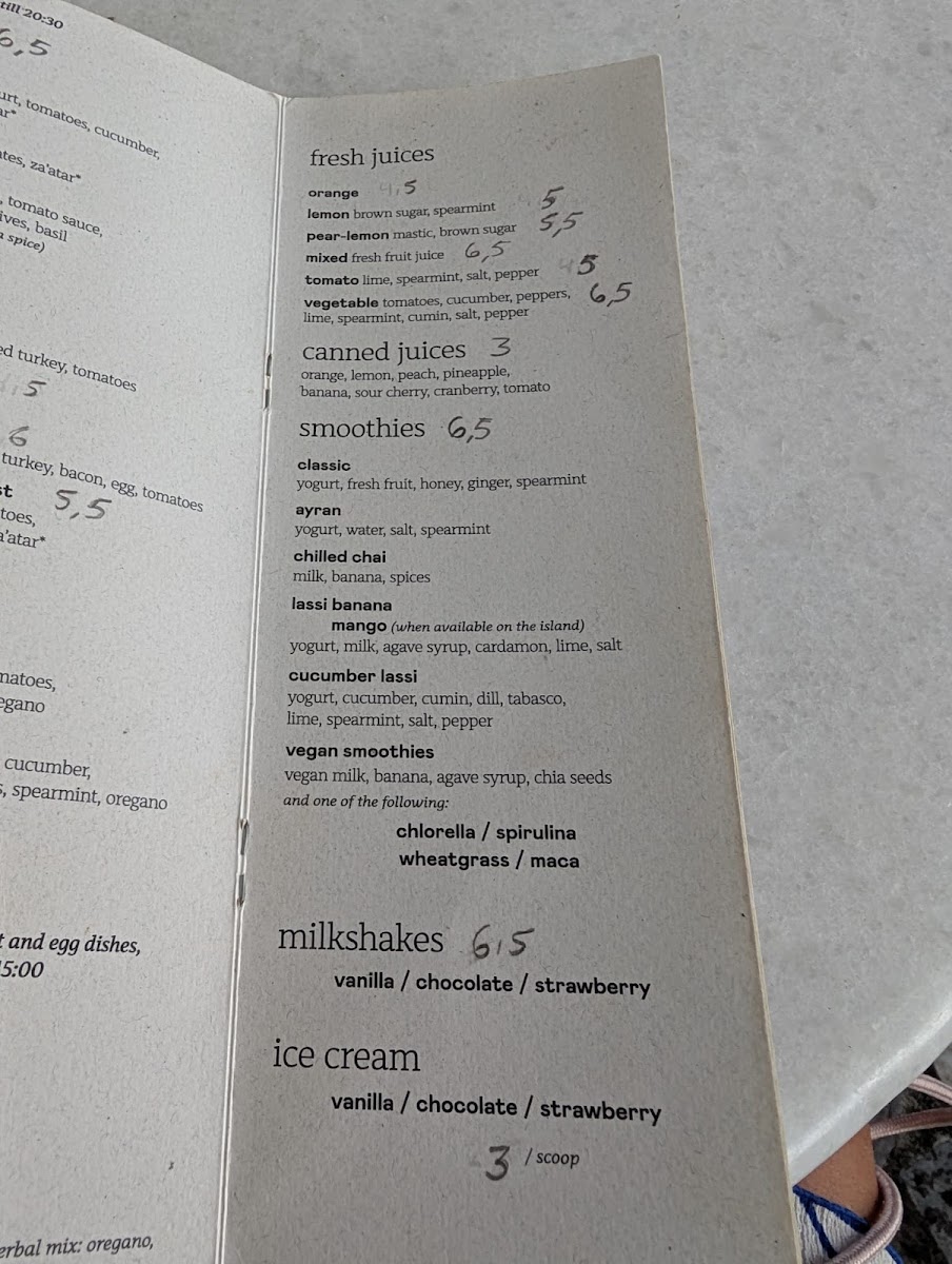 The menu highlights a variety of coffee styles from traditional Greek coffees infused with mastic to refreshing freddo espresso and café au lait. Alongside these, fresh and natural options like vegan smoothies with chlorella and freshly squeezed juices fit seamlessly into the laid-back, sunlit atmosphere. Light dishes such as mikrasiatiko (Asia Minor) breakfast plates, dakos, omelets, and pastries like paximadi offer balanced, flavorful choices that complement the café’s inviting and cozy vibe.